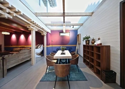 在房子的整体格局上,设计师将入门区域从东侧调整到南侧,可用面积扩大了4个平米。保留了老建筑内的格局后,拆除整个庭院中的建筑重新进行规划,打造不同的使用空间,做流线化处理。一楼是相互贯穿的阳光房大客厅和一个卧室,二楼区域则为卫生间,佛堂和两个卧室。